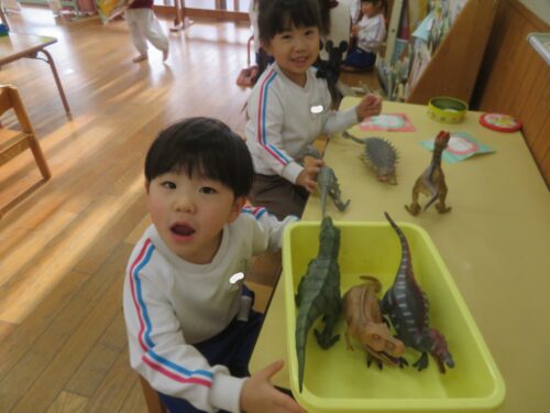 さて、クラスの中では、クリスマスにサンタさんからもらった恐竜のおもちゃで遊んでいます😊