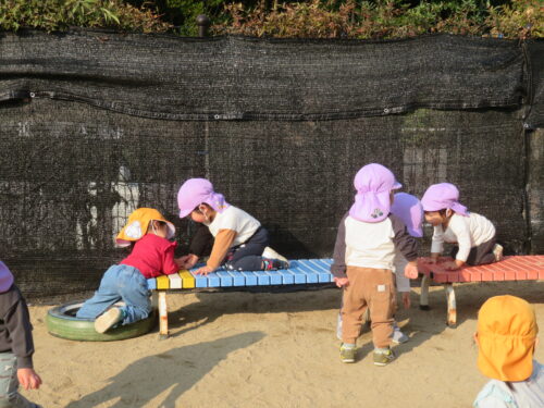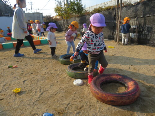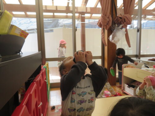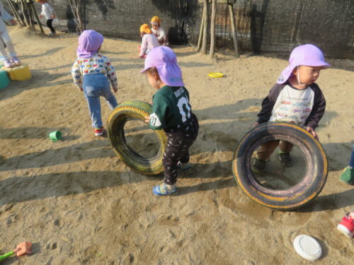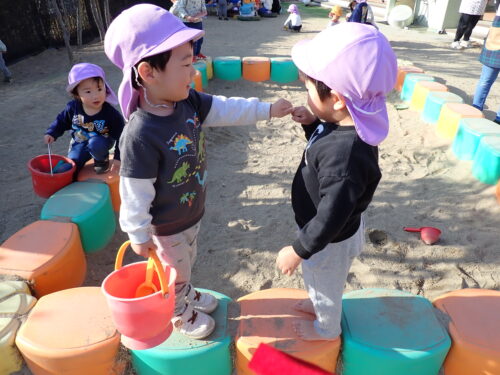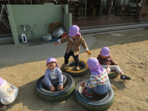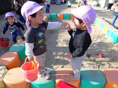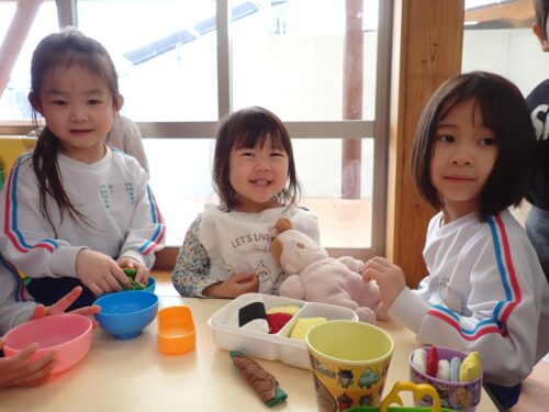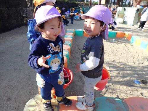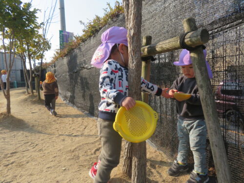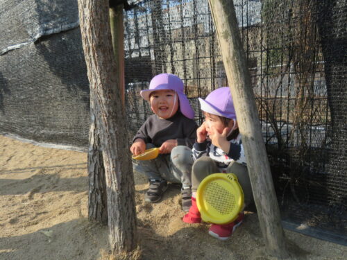 園庭では、「まてまて~」と追いかけっこや、砂場でお店屋さんごっこをして忙しそうに遊んでいます