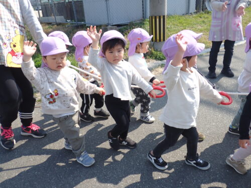 横断歩道ではピシッと手あげますピースをしているお友達も