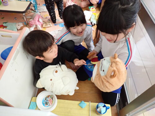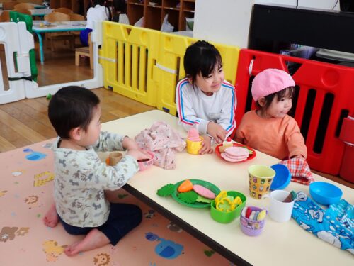 お兄さんお姉さんと一緒におままごとを楽しむ姿も