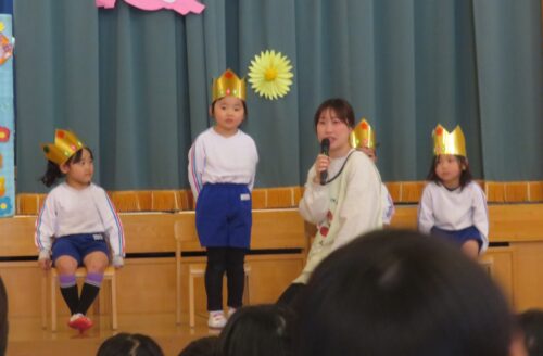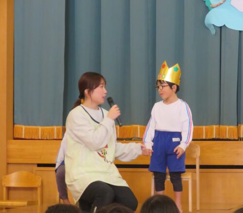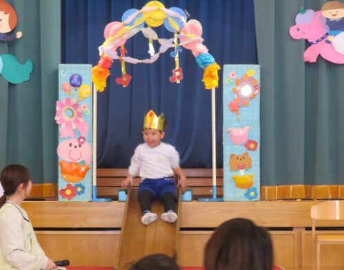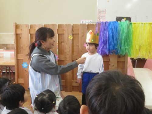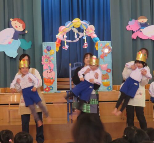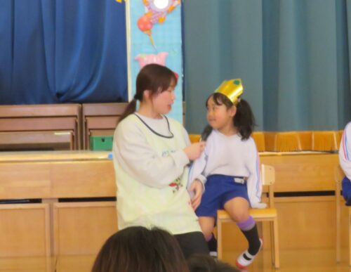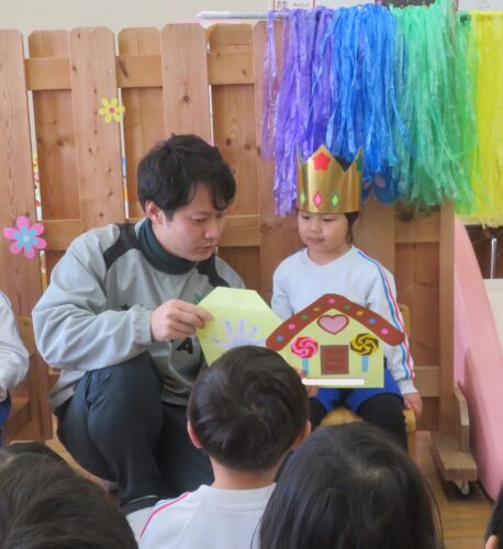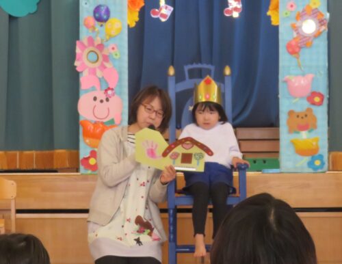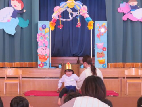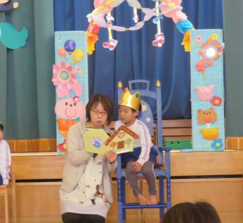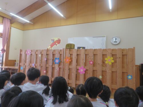 先生達からの出し物は「どうぞのいす」のペープサートでした!お話を知っているお友達も多いので