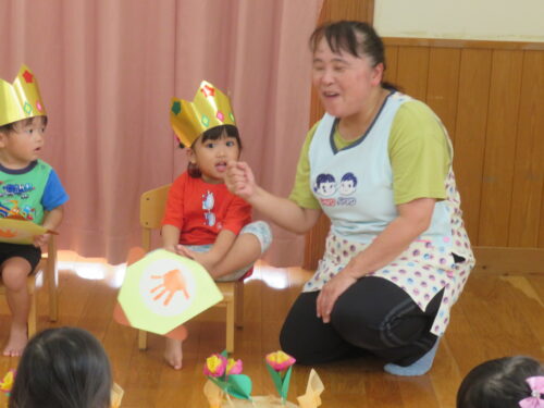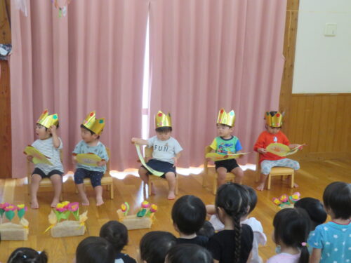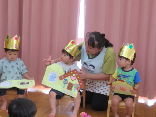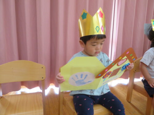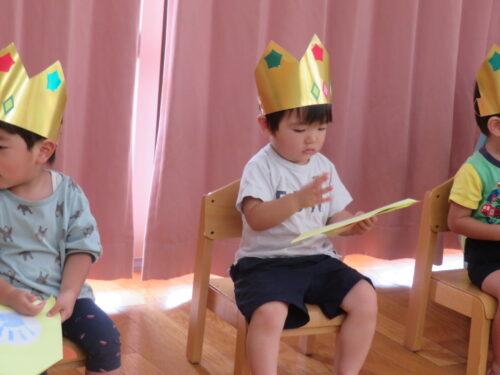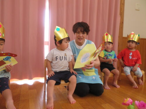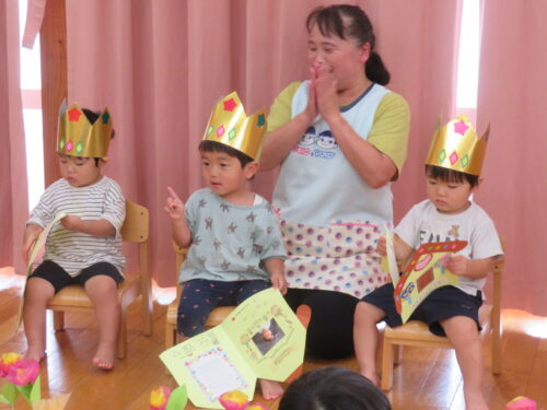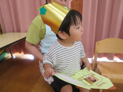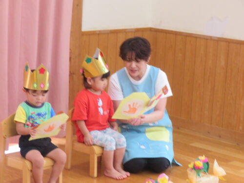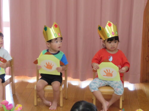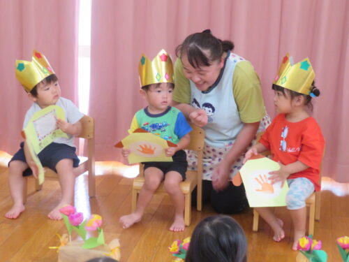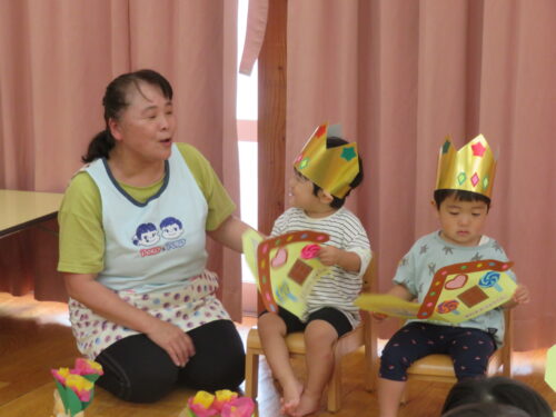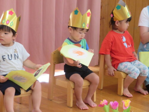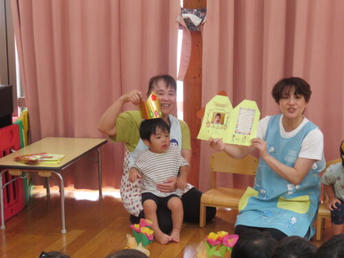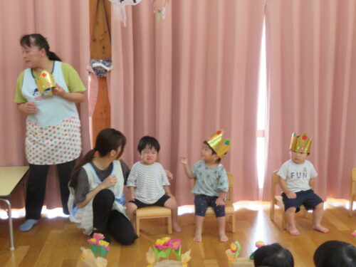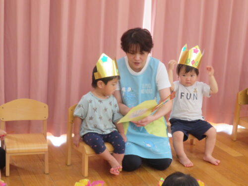 おたんじょうびの歌を歌ってもらって嬉しそうな子どもたちです