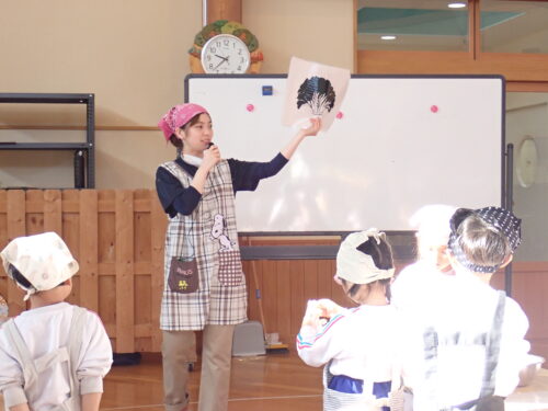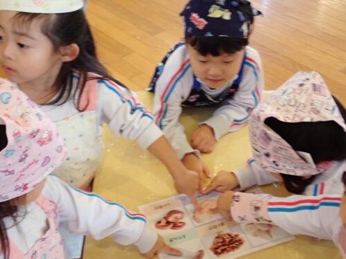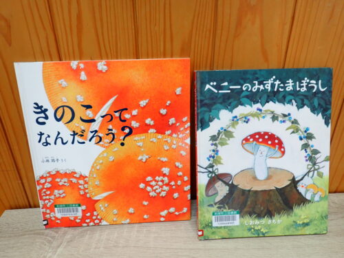 クッキングの前に、きのこが沢山出てくる絵本をクラスで先生に読んでもらい、きのこには色々な種類があることを知ってもらいました📙