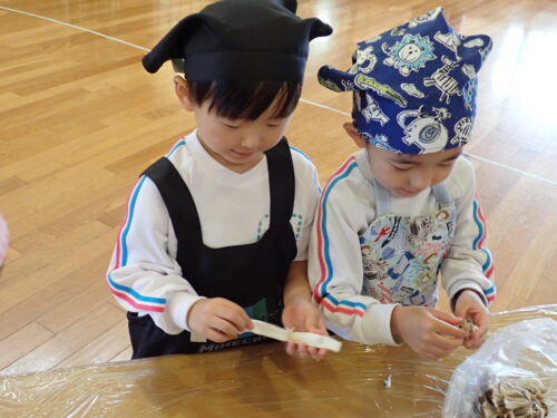 同じグループのお友達と協力して、みんなのお口に入るくらい小さく割いていきますよ~!