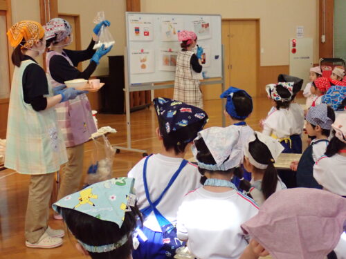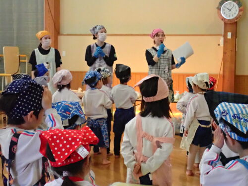 まずは給食の先生から、作り方の説明を聞きますよ~👂🏻