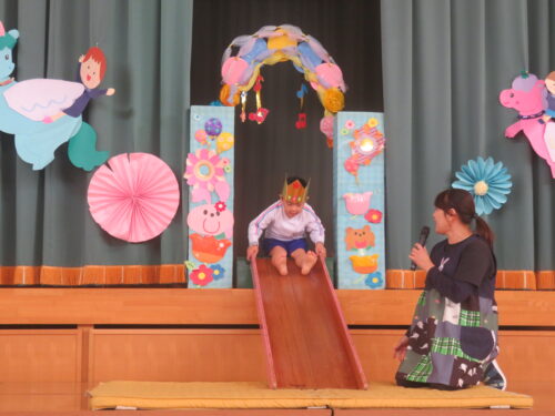 11月生まれのお友達がお名前を呼ばれて滑り台から登場です!